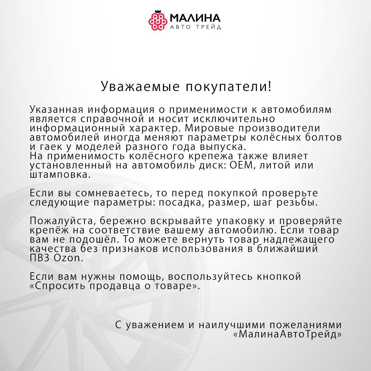 Колесные болты является важным компонентом безопасности. Пожалуйста, перед установкой убедитесь, что заказываемые болты имеют правильный размер резьбы и длину/ширину. Кроме этого убедитесь, что посадочное место ваших колёс соответствует заказаным болтам. Установка колоёсных болтов с неверными характеристиками может привести к ослаблению или потерю колеса во время движения автомобиля.