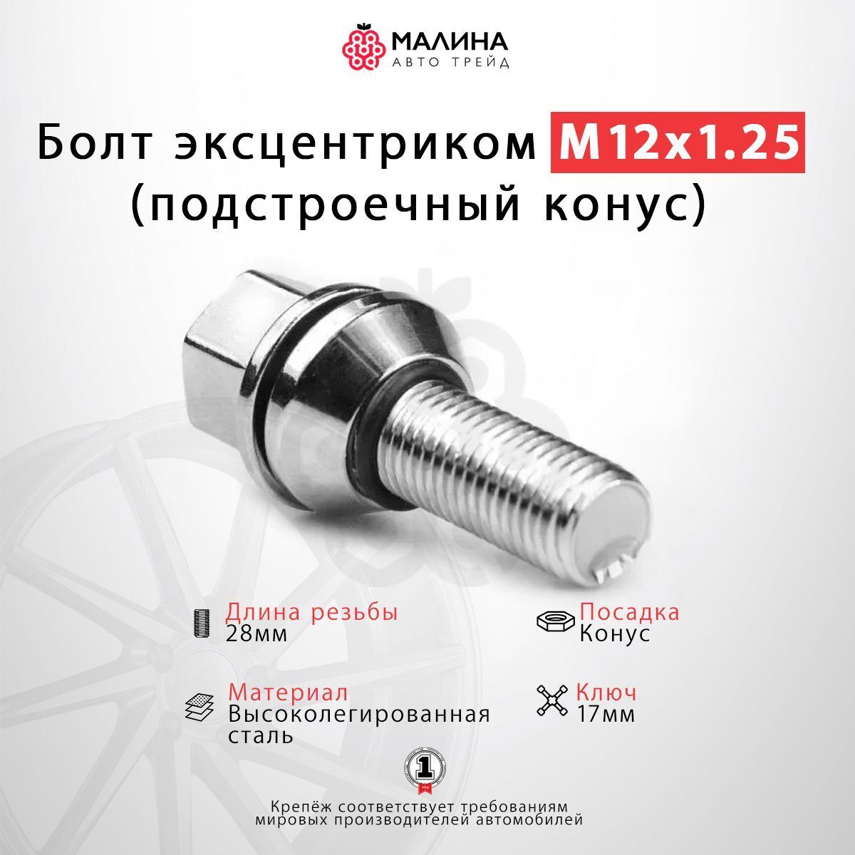 Болт колёсный с эксцентриком М12x1.25 длина резьбы 28мм ключ 17мм конус (подстроечный конус) 20 шт для Lada, ВАЗ, Лада Калина / Гранта / Приора, Alfa Romeo, Fiat, Lancia, Seat, Skoda Favorit, Peugeot, Citroen