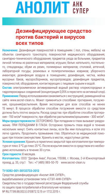 Дезинфицирующее средство «АНОЛИТ АНК Супер» уничтожает широкий спектр инфекций, бактерий, вирусов, микробов и грибков, в том числе, возбудителей туберкулеза, пневмонии, герпеса и пр. Клинические тесты подтвердили большую его эффективность в сравнении с традиционными обеззараживающими растворами. При этом «АНОЛИТ» имеет значительно меньшую коррозионную активность. Он универсален и абсолютно безопасен для человека и окружающей среды, не оставляет следов после высыхания и не требует смывания.